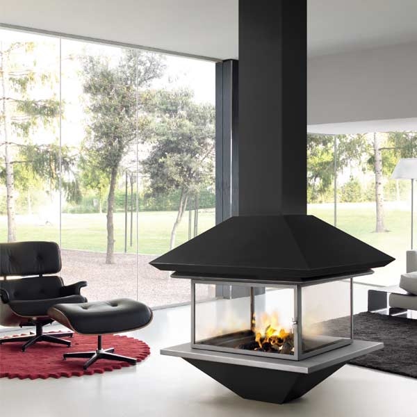 Центральный камин квадратной формы с двойным корпусом, составное стекло из 4 частей. Цвет - чёрный.