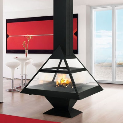 Центральный камин с двумя стеклянными дверцами, с подножием и телескопическим элементом. Цвет - чёрный. Камин разработан для панорамного обзора огня при установке в любое место помещения.