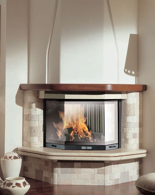 Угловая модель выполнена из мозаичного травертина разных оттенков, на полке из полированного стонелита цвета слоновой кости - деревянная вставка, балка из массива дерева.