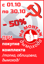 С 1 по 31 октября у нас действуют революционные условия! При покупке полного комплекта из топки, облицовки и дымохода Вы получаете скидку 50% на установку дымохода*. Узнайте подробности в салонах «Центр каминов и котлов» или по телефону: (495) 640-45-56